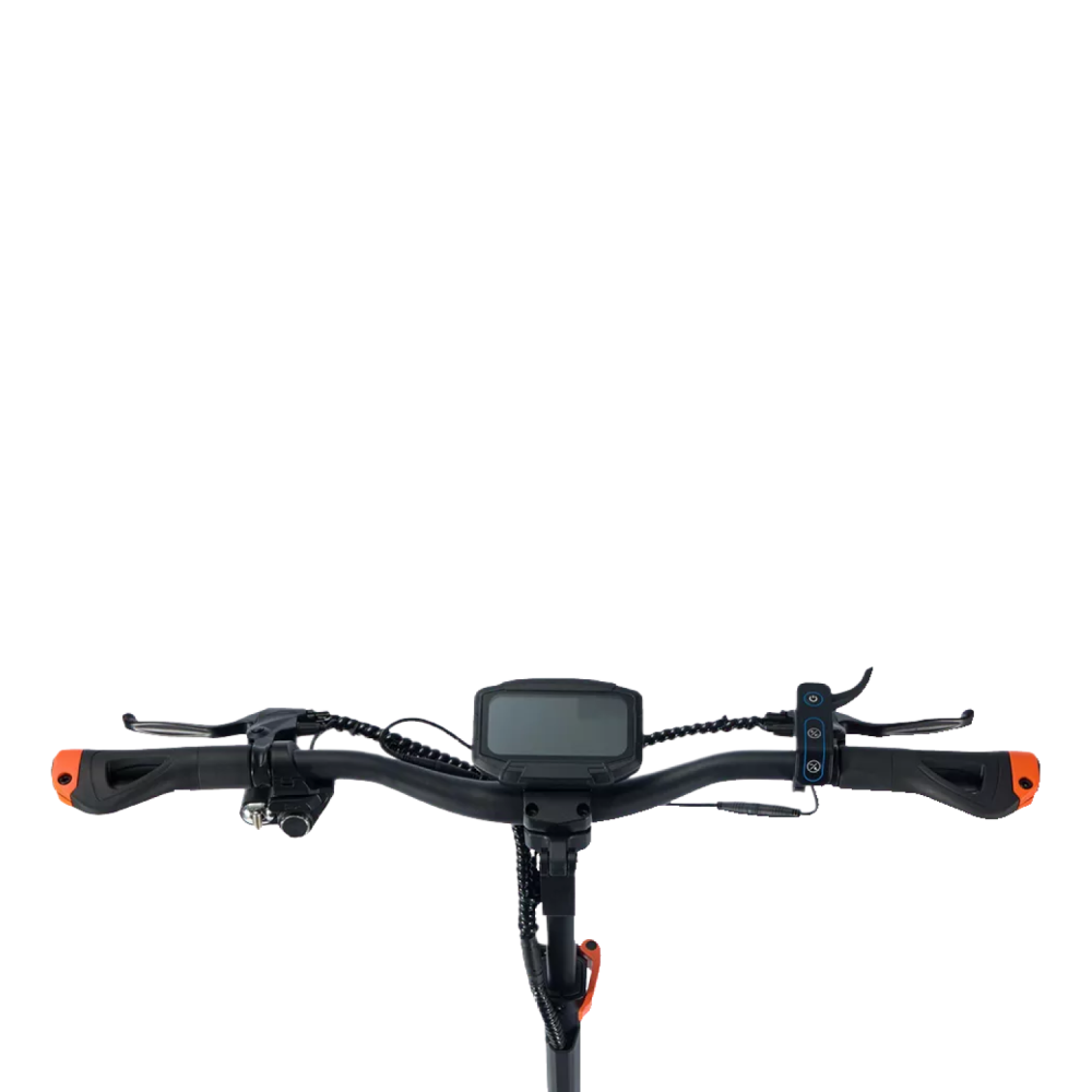 Kugoo F3 Plus рассчитан на нагрузку до 130 кг и покоряет подъёмы с углом до 25°. Широкая дека и руль (685 мм) делают поездку максимально удобной даже на дальние расстояния. Дисплей с бортовым компьютером отображает ключевые показатели: скорость, заряд, пробег.