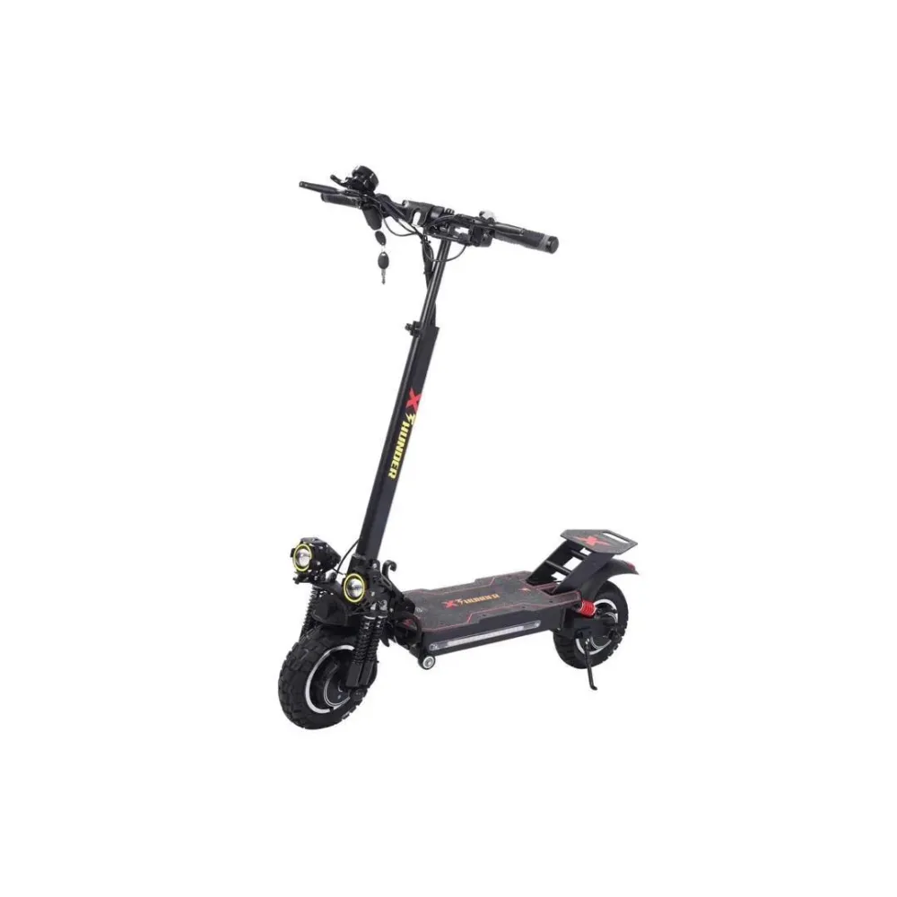 Электросамокат WS-Thunder 2400W 48V21ah - достойный представитель городского экологического транспорта. Производители оснастили данную модель производительными моторами суммарной мощностью 2400 W, которые позволяют развивать впечатляющую скорость до 50 км/час. Полный привод обеспечивает хорошую проходимость и возможность преодолевать подъемы и небольшие препятствия на пути. Во время движения по ровным городским улицам полный привод можно отключить, что уменьшит расход аккумуляторной батареи. 10-дюймовые колеса с глубоким протектором обеспечивают хорошее сцепление с дорожным покрытием, позволяя сохранять устойчивость при движении и маневрировании. Электросамокат выполнен из прочного алюминиевого сплава и выдерживает нагрузку до 155 кг, вес самого устройства при этом составляет 29 кг. Складная конструкция делает электросамокат более компактным и удобным для хранения и транспортировки. Маленькие колесики в передней части платформы позволяют катить самокат в сложенном виде, не поднимая его полностью. Система освещения включает три элемента в передней части электроскутера (основной фонарь посередине и два дополнительных по бокам), а также три габаритных огня сзади. На боковой части платформы расположена светодиодная подсветка, которая делает электроскутер более заметным в темное время суток.