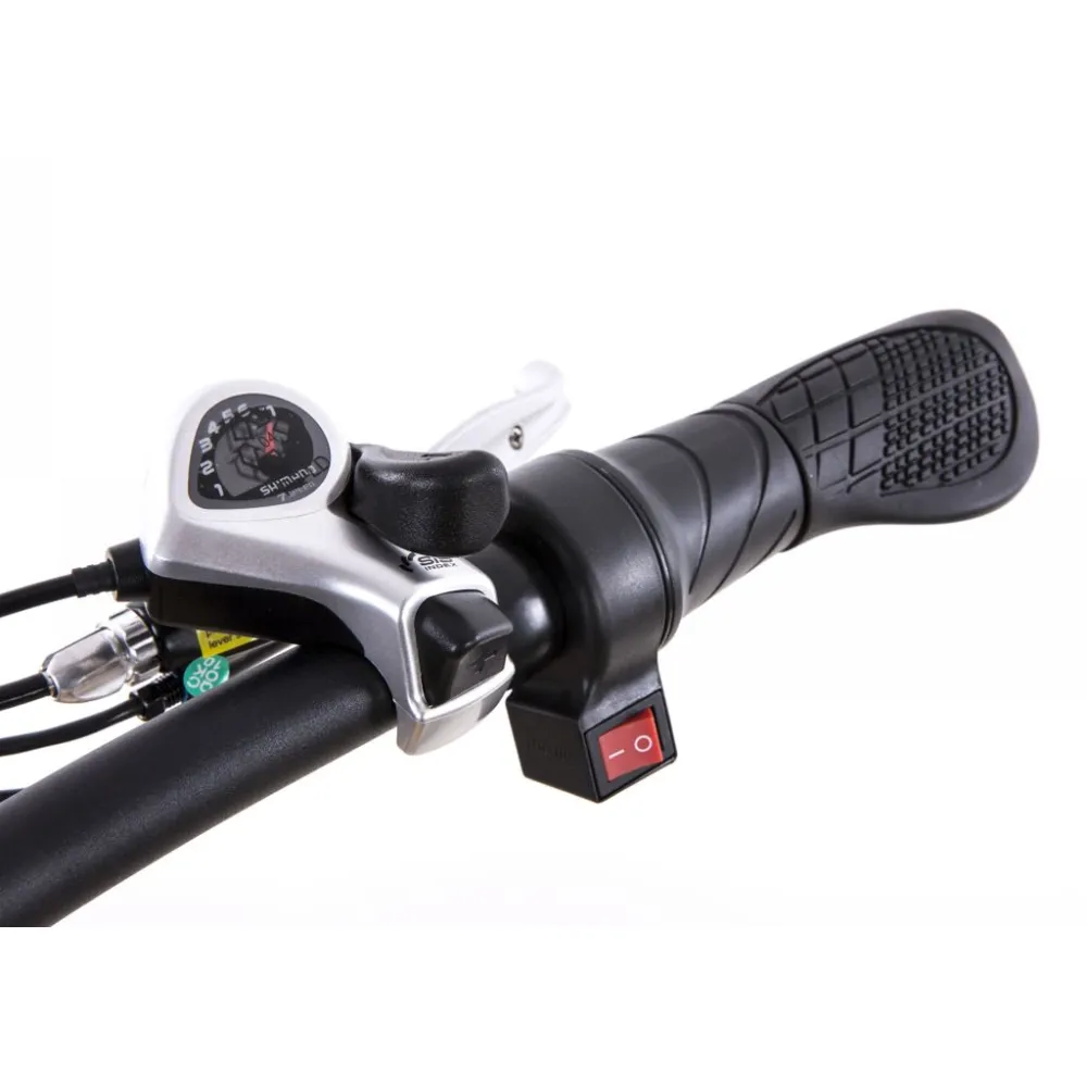 Материал рамы – алюминиевый сплав 6061. В базовой комплектации 1 механическая скорость, а в VIP модели 7 скоростей. Также в последнем присутствует амортизационная вилка. На руле есть индикатор батареи, который подскажет вам, что пора ставить аккумулятор на зарядку, а также usb разъем для подзарядки гаджетов.