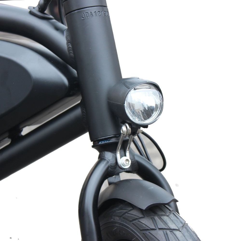 Информационный дисплей установлен на руле, на нем можно отслеживать показатели устройства. Впереди яркая фара, сзади стоп-сигнал. Заводиться электровелосипед от ключа.