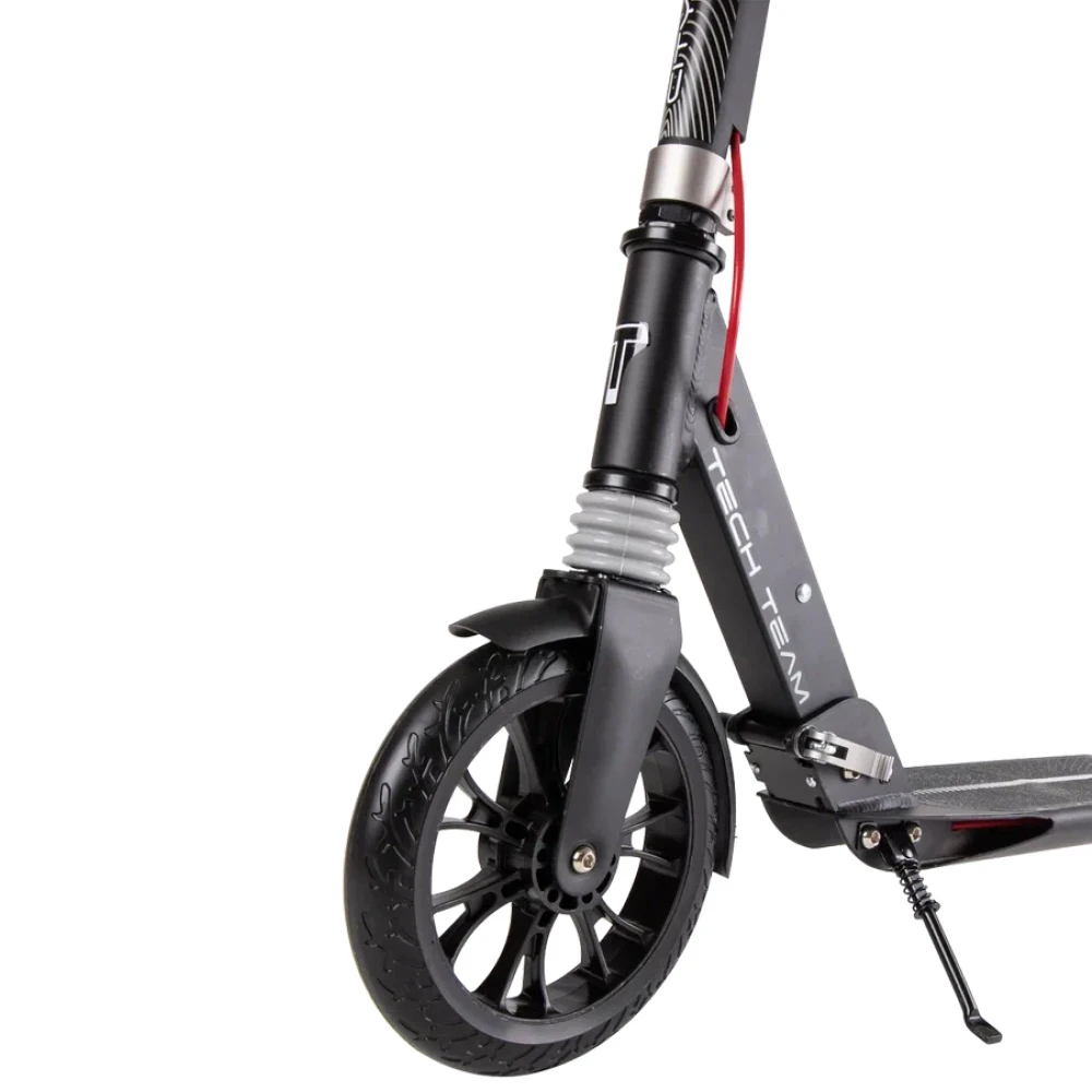 Самокат оснащен полиуретановыми мало стираемыми колесами с параметрами 200*30 мм. В сочетании с подшипниками класса ABEC 9 модель гарантирует отличный накат. Наличие дискового тормоза, амортизаторов и прорезиненных элементов делает езду безопасной, минимизирует риск падения.