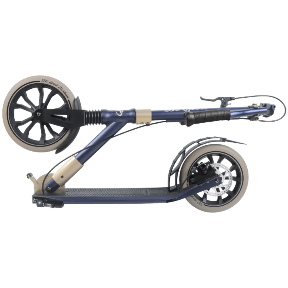 Самокат SPORT 250R  - модельный ряд бренда оснащен передним амортизатором, имеет новые конструктивные особенности. Самокат рассчитан для езды по городской местности. Минимальный возраст ездока – 9 лет. Вес техники составляет 6,5 кг. Визуально ознакомиться с моделью, купить самокат по цене производителя предлагает наш интернет-магазин. Сотрудничество с нами гарантирует ряд преимущественных характеристик: быструю доставку, возможность бесплатного консультирования, другую профессиональную помощь, покупку других дополнительных аксессуаров, участие в бонусных акциях.
