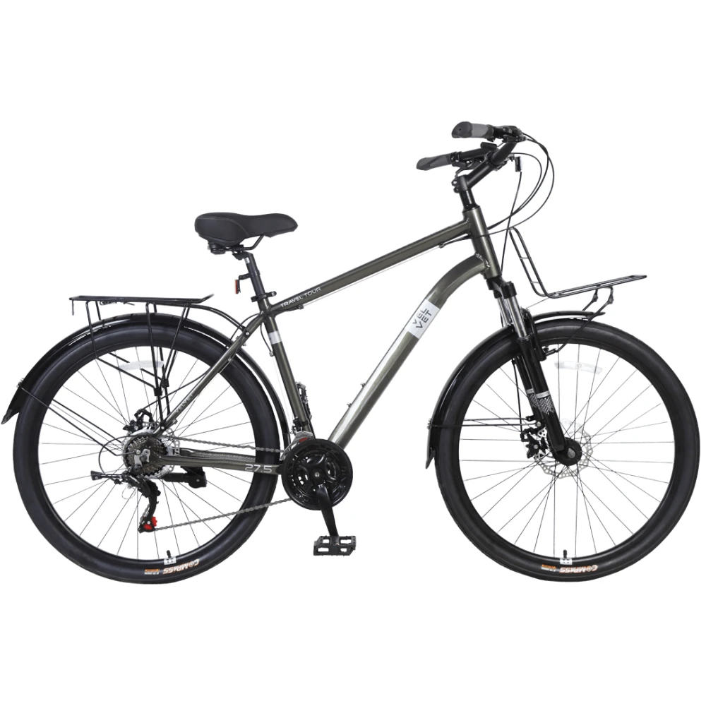 Модель оборудована эргономическим седлом, которое регулируется при необходимости. Маленький вес велосипеда объясняется рамой хардтейл, которая позволяет плавно входить в повороты и обеспечивает хорошую маневренность. Амортизационная вилка с алюминиевой короной уменьшает жесткость от дорожных неровностей. Свободно подстроится под тип дороги и ехать комфортно на любой из 21 скоростей позволят оригинальные переключатели Shimano. На велосипеде размещены 2 вместительных багажника, позволяющие перевозить небольшие грузы и освободить руки при поездках. Пластиковые крылья защищают райдера от брызг и грязи. Колеса на алюминиевых ободах имеют крупный протекторный рисунок для лучшего сцепления с дорожным полотном. Комбинация из дисковых и механических тормозов позволит райдеру чувствовать себя безопасно при быстрой езде.